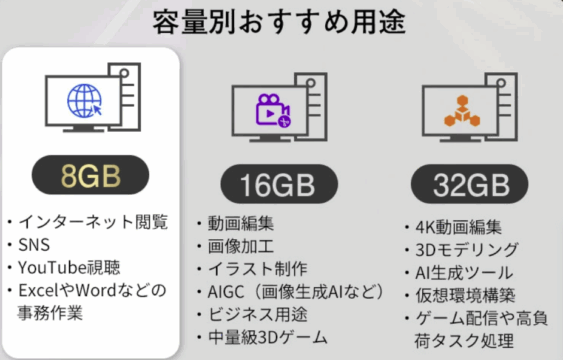 なお、データセンター需要により、メモリ価格は爆上がりしていますので、早めの対策や買い替えのおススメが書くPCメーカーより案内されています。